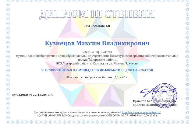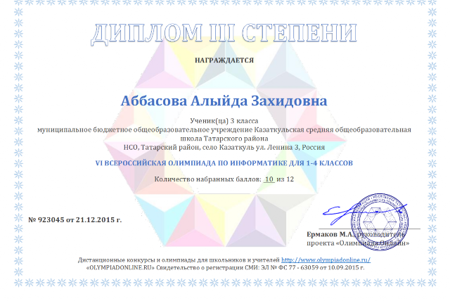 Диплом III степени в IV ВСЕРОССИЙСКОЙ ОЛИМПИАДЫ ПО ИНФОРМАТИКЕ ДЛЯ 1-4 классы награждается