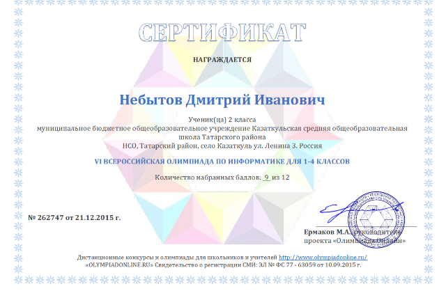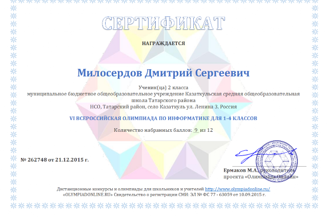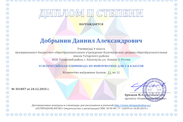 Диплом II степени в IV ВСЕРОССИЙСКОЙ ОЛИМПИАДЫ ПО ИНФОРМАТИКЕ ДЛЯ 1-4 классы награждается