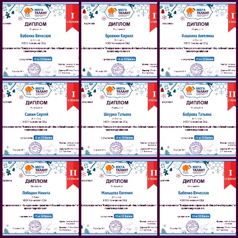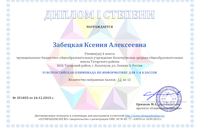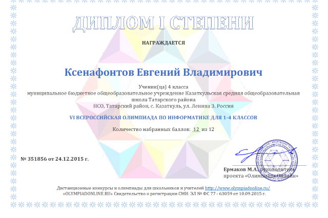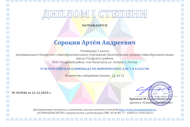 Диплом I степени в IV ВСЕРОССИЙСКОЙ ОЛИМПИАДЫ ПО ИНФОРМАТИКЕ ДЛЯ 1-4 классы награждается