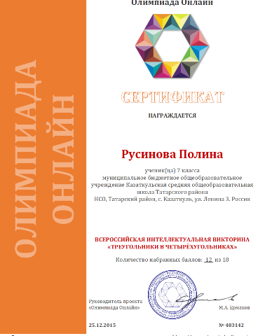 Сертификат в IV ВСЕРОССИЙСКОЙ ИНТЕЛЕКТУАЛЬНОЙ ВИКТОРИНЕ "ТРЕУГОЛЬНИКИ В ЧЕТЫРЕХУГОЛЬНИКАХ"