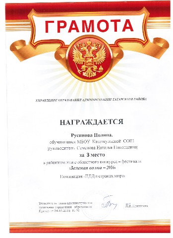Районный конкурс "Зеленная волна - 2016!". Русинова Полина - 3 место. |