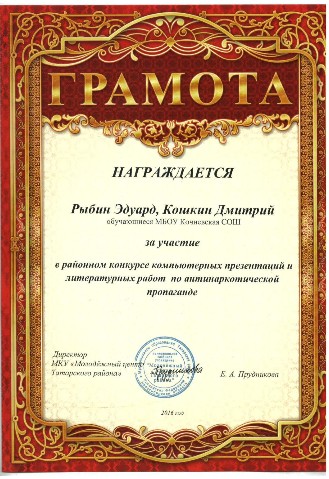 Районный конкурс компьютерных презентаций и литературных работ по антинаркотической пропаганде, участие. | |